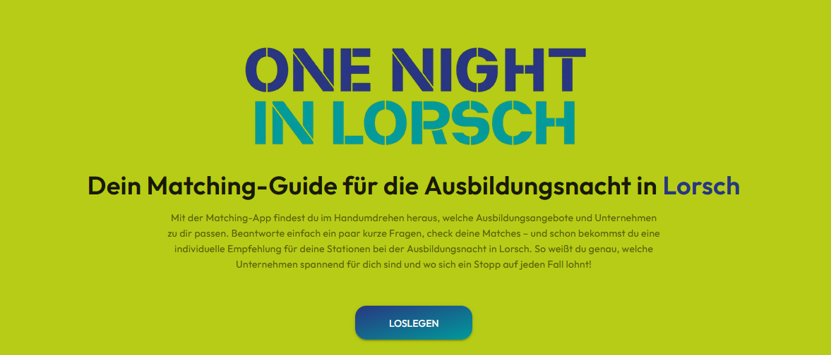 Mit unserem Matching-Tool findest Du den Ausbildungsplatz, der am besten zu Deinen Interessen passt. Klicke Dich durch einige kurze Fragen und Du erhältst Deine Matches. Speichere Dir diese und besuche die Unternehmen am 06.02.2026. Hier der Link zum Matching-Tool: https://one-night-in-lorsch.recrewt.de/home