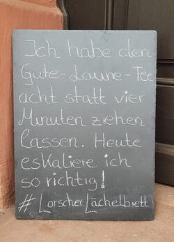 Das „Lorscher Lächelbrett“ ist eine Schiefertafel, die mit individuellen, aber vor allem lustigen Sprüchen beschriftet wird. Die „Lächelbretter“ werden am Eingang der Geschäfte, Restaurants und Dienstleistungsbetriebe positioniert und sollen schon beim Betreten für eine positive und heitere Stimmung sowie das ein oder andere kleine Lachen sorgen. Ausgehend vom Kaiser-Wilhelm-Platz, entlang der Römerstraße bis zum Ende der Einkaufsstraße wird für Besucherinnen und Besucher der Lorscher Innenstadt der Bummel somit zur „Schmunzeltour“.