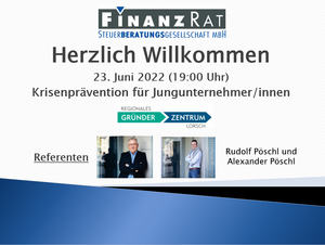 Genau auf diese Fragen wollen wir Antworten finden – zusammen mit den Experten der Finanzrat Steuerberatungsgesellschaft mbH und RP Marketing, die bereits seit vielen Jahren in der Beratung von Existenzgründenden und Jungunternehmen tätig sind. Neben dem informativen Vortrag stehen Ihnen die Referenten auch für Ihre persönlichen Fragen zur Verfügung.