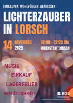 Die Lorscher Innenstadt erstrahlt am Freitag, den 14.11.2025 von 18:00 – 22:00 Uhr in einem zauberhaften Lichterglanz und lädt zum gemütlichen Einkaufsbummel und Verweilen ein.