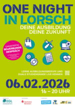 Ausbildungsberufe live erleben: Lorscher Unternehmen präsentieren sich bei One Night in Lorsch. Schülerinnen und Schüler können sich am 06. Februar 2026 von 16:00 Uhr bis 20:00 Uhr direkt in 18 Unternehmen über mehr als 40 verschiedene Ausbildungsberufe und Duale Studiengänge informieren.
